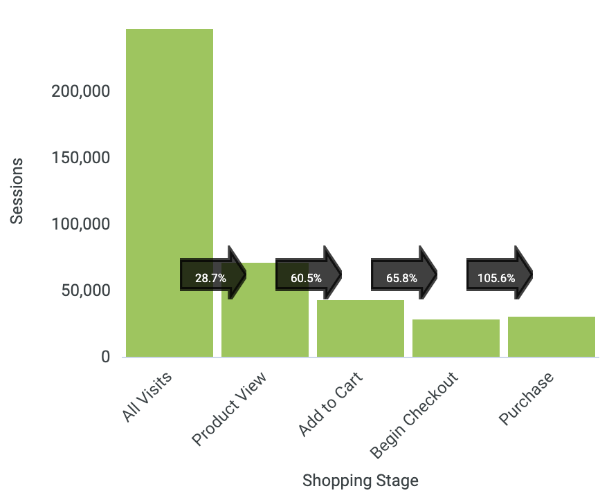 The second resulting reason why conversion rate could change is because of changes to the site including the home page, category pages, product landing pages (PLP) and product detail pages (PDP) can each have an impact on overall conversion rate. The best way to determine which of these is impacting your overall site is to look at your general site conversion by comparing the shopping stage funnel over time.