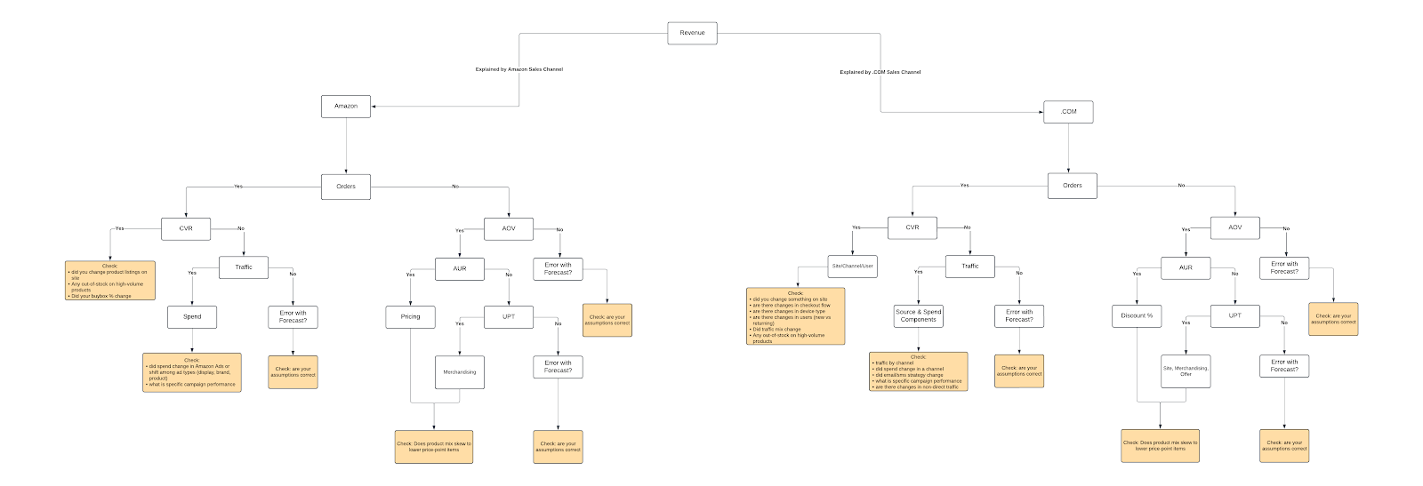 We start at the root node which is the simple question of has revenue significantly deviated from our plan? We can answer this with a simple yes / no and determine if that revenue deviation is from our own .com or from a marketplace (Amazon). The answer to this question will then lead us to a decision node where we are asked a subsequent question. By answering the additional question(s), we will eventually hit a leaf node where we have answered enough questions to help us identify the reason our revenue has deviated from plan.