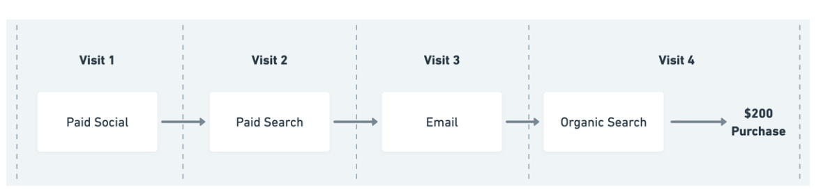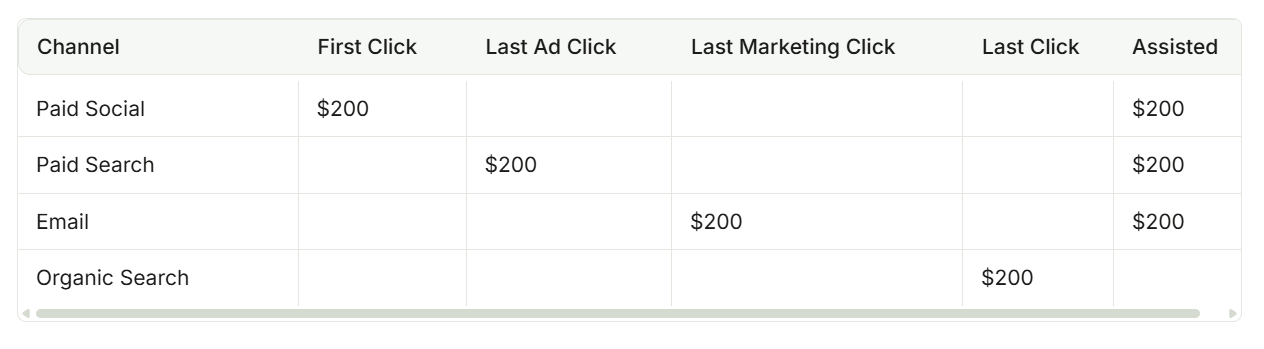 Say a customer visits your site four times before making a $200 purchase: first through paid social, then paid search, then email, then organic search. Under last-click, organic search gets the credit. With assisted attribution, all four channels are credited. Without that view, you'd never know that three of those four channels contributed to the sale.