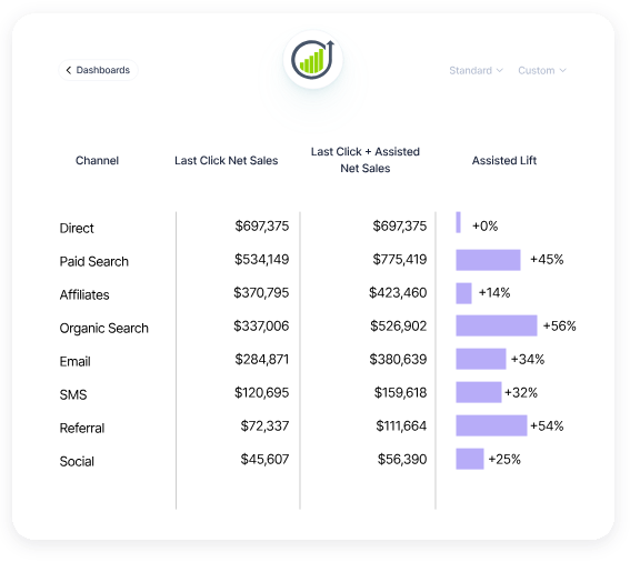 This is where things get more interesting. Daasity's Assisted Attribution, also known as multitouch attribution, assigns full credit to every channel that had a touchpoint prior to purchase, not just the one that got the last click. If a customer touched paid search, email, and organic search before buying, all three channels get credited. (If an order involved a channel more than once, it's only credited once.)